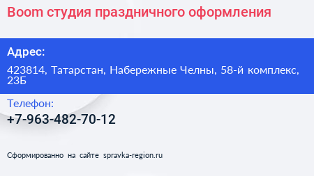 Boom, студия праздничного оформления по адресу 423814, Татарстан, Набережные Челны, 58-й комплекс, 23Б в дальнейшем Организация, размещена в следующих категориях: