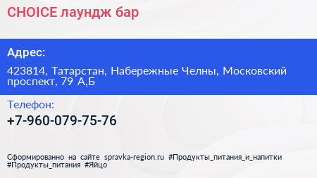 CHOICE, лаундж-бар по адресу 423814, Татарстан, Набережные Челны, Московский проспект, 79 А,Б в дальнейшем Организация, размещена в следующих категориях: