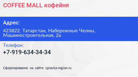 COFFEE MALL, кофейня по адресу 423822, Татарстан, Набережные Челны, Машиностроительная, 2а в дальнейшем Организация, размещена в следующих категориях: