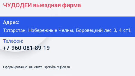 ЧУДОДЕИ, выездная фирма по адресу Татарстан, Набережные Челны, Боровецкий лес 3, 4 ст1 в дальнейшем Организация, размещена в следующих категориях: