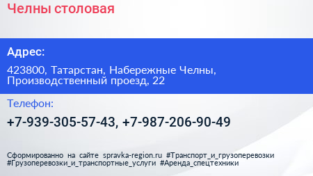 Челны, столовая по адресу 423800, Татарстан, Набережные Челны, Производственный проезд, 22 в дальнейшем Организация, размещена в следующих категориях:
