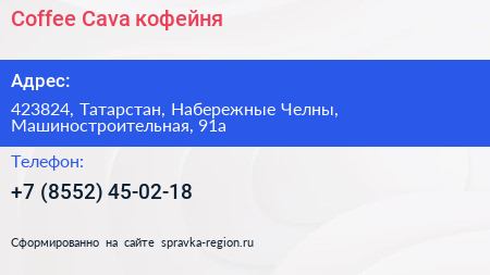 Coffee Cava, кофейня по адресу 423824, Татарстан, Набережные Челны, Машиностроительная, 91а в дальнейшем Организация, размещена в следующих категориях: