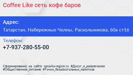 Coffee Like, сеть кофе-баров по адресу Татарстан, Набережные Челны, Раскольникова, 60а ст16 в дальнейшем Организация, размещена в следующих категориях: