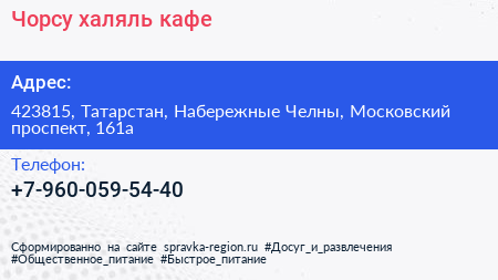Чорсу, халяль-кафе по адресу 423815, Татарстан, Набережные Челны, Московский проспект, 161а в дальнейшем Организация, размещена в следующих категориях: