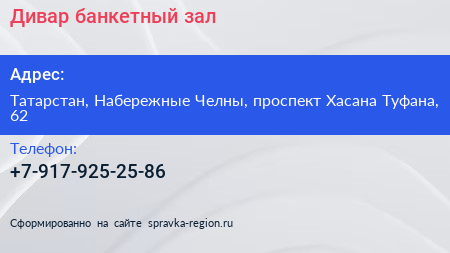 Дивар, банкетный зал по адресу Татарстан, Набережные Челны, проспект Хасана Туфана, 62 в дальнейшем Организация, размещена в следующих категориях: