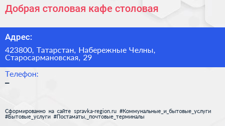 Добрая столовая, кафе-столовая по адресу 423800, Татарстан, Набережные Челны, Старосармановская, 29 в дальнейшем Организация, размещена в следующих категориях: