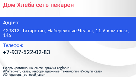 Дом Хлеба, сеть пекарен по адресу 423812, Татарстан, Набережные Челны, 11-й комплекс, 14а в дальнейшем Организация, размещена в следующих категориях: