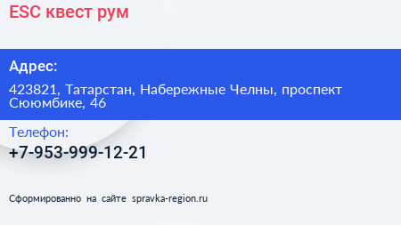 ESC, квест-рум по адресу 423821, Татарстан, Набережные Челны, проспект Сююмбике, 46 в дальнейшем Организация, размещена в следующих категориях: