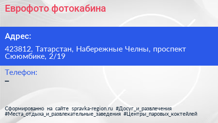 Еврофото, фотокабина по адресу 423812, Татарстан, Набережные Челны, проспект Сююмбике, 2/19 в дальнейшем Организация, размещена в следующих категориях: