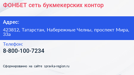 ФОНБЕТ, сеть букмекерских контор по адресу 423812, Татарстан, Набережные Челны, проспект Мира, 33а в дальнейшем Организация, размещена в следующих категориях:
