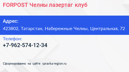 FORPOST Челны, лазертаг-клуб по адресу 423802, Татарстан, Набережные Челны, Центральная, 72 в дальнейшем Организация, размещена в следующих категориях: