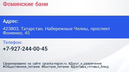Фоминские бани по адресу 423803, Татарстан, Набережные Челны, проспект Фоменко, 45 в дальнейшем Организация, размещена в следующих категориях: