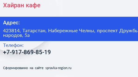 Хайран, кафе по адресу 423814, Татарстан, Набережные Челны, проспект Дружбы народов, 5а в дальнейшем Организация, размещена в следующих категориях: