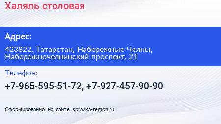 Халяль, столовая по адресу 423822, Татарстан, Набережные Челны, Набережночелнинский проспект, 21 в дальнейшем Организация, размещена в следующих категориях: