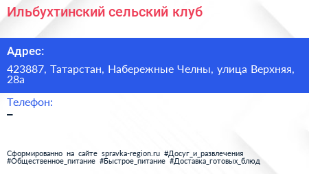 Ильбухтинский сельский клуб по адресу 423887, Татарстан, Набережные Челны, улица Верхняя, 28а в дальнейшем Организация, размещена в следующих категориях: