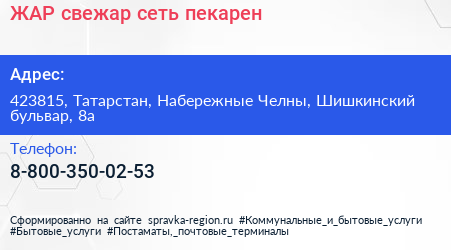 ЖАР свежар, сеть пекарен по адресу 423815, Татарстан, Набережные Челны, Шишкинский бульвар, 8а в дальнейшем Организация, размещена в следующих категориях: