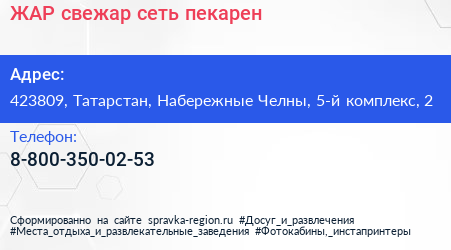 ЖАР свежар, сеть пекарен по адресу 423809, Татарстан, Набережные Челны, 5-й комплекс, 2 в дальнейшем Организация, размещена в следующих категориях: