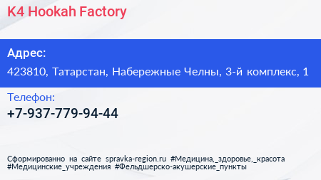 K4 Hookah Factory по адресу 423810, Татарстан, Набережные Челны, 3-й комплекс, 1 в дальнейшем Организация, размещена в следующих категориях: