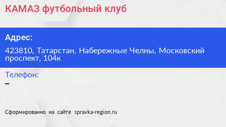 КАМАЗ, футбольный клуб по адресу 423810, Татарстан, Набережные Челны, Московский проспект, 104к в дальнейшем Организация, размещена в следующих категориях: