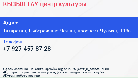 КЫЗЫЛ ТАУ, центр культуры по адресу Татарстан, Набережные Челны, проспект Чулман, 119в в дальнейшем Организация, размещена в следующих категориях: