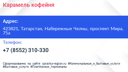 Карамель, кофейня по адресу 423821, Татарстан, Набережные Челны, проспект Мира, 75а в дальнейшем Организация, размещена в следующих категориях: