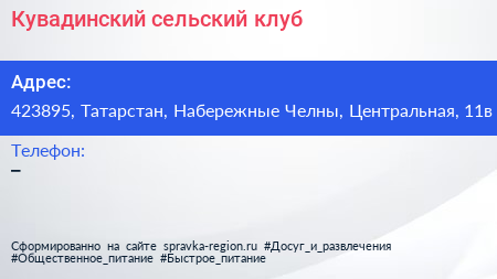 Кувадинский сельский клуб по адресу 423895, Татарстан, Набережные Челны, Центральная, 11в в дальнейшем Организация, размещена в следующих категориях: