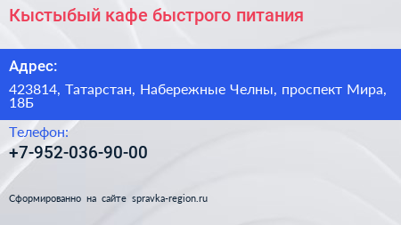 Кыстыбый, кафе быстрого питания по адресу 423814, Татарстан, Набережные Челны, проспект Мира, 18Б в дальнейшем Организация, размещена в следующих категориях: