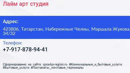 Лайм, арт-студия по адресу 423806, Татарстан, Набережные Челны, Маршала Жукова, 34/32 в дальнейшем Организация, размещена в следующих категориях: