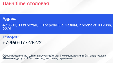 Ланч time, столовая по адресу 423800, Татарстан, Набережные Челны, проспект Камаза, 22/6 в дальнейшем Организация, размещена в следующих категориях: