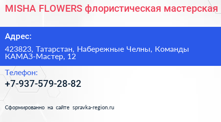 МISHA FLOWERS, флористическая мастерская по адресу 423823, Татарстан, Набережные Челны, Команды КАМАЗ-Мастер, 12 в дальнейшем Организация, размещена в следующих категориях: