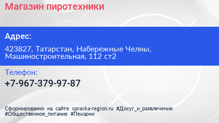 Магазин пиротехники по адресу 423827, Татарстан, Набережные Челны, Машиностроительная, 112 ст2 в дальнейшем Организация, размещена в следующих категориях: