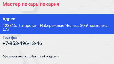 Мастер пекарь, пекарня по адресу 423815, Татарстан, Набережные Челны, 30-й комплекс, 17а в дальнейшем Организация, размещена в следующих категориях:
