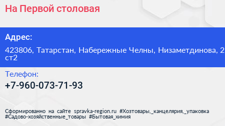 На Первой, столовая по адресу 423806, Татарстан, Набережные Челны, Низаметдинова, 2 ст2 в дальнейшем Организация, размещена в следующих категориях: