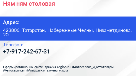 Ням-ням, столовая по адресу 423806, Татарстан, Набережные Челны, Низаметдинова, 20 в дальнейшем Организация, размещена в следующих категориях: