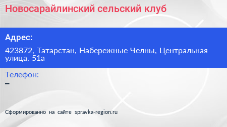 Новосарайлинский сельский клуб по адресу 423872, Татарстан, Набережные Челны, Центральная улица, 51а в дальнейшем Организация, размещена в следующих категориях: