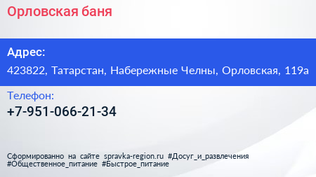 Орловская, баня по адресу 423822, Татарстан, Набережные Челны, Орловская, 119а в дальнейшем Организация, размещена в следующих категориях: