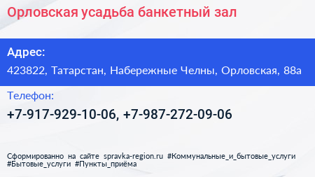 Орловская усадьба, банкетный зал по адресу 423822, Татарстан, Набережные Челны, Орловская, 88а в дальнейшем Организация, размещена в следующих категориях:
