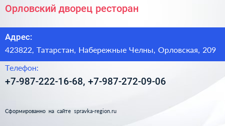 Орловский дворец, ресторан по адресу 423822, Татарстан, Набережные Челны, Орловская, 209 в дальнейшем Организация, размещена в следующих категориях: