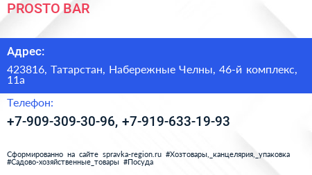 PROSTO-BAR по адресу 423816, Татарстан, Набережные Челны, 46-й комплекс, 11а в дальнейшем Организация, размещена в следующих категориях: