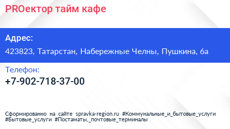 PROектор, тайм-кафе по адресу 423823, Татарстан, Набережные Челны, Пушкина, 6а в дальнейшем Организация, размещена в следующих категориях: