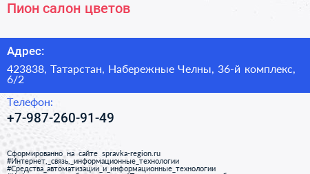 Пион, салон цветов по адресу 423838, Татарстан, Набережные Челны, 36-й комплекс, 6/2 в дальнейшем Организация, размещена в следующих категориях: