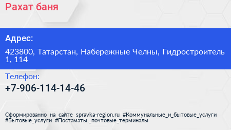 Рахат, баня по адресу 423800, Татарстан, Набережные Челны, Гидростроитель 1, 114 в дальнейшем Организация, размещена в следующих категориях: