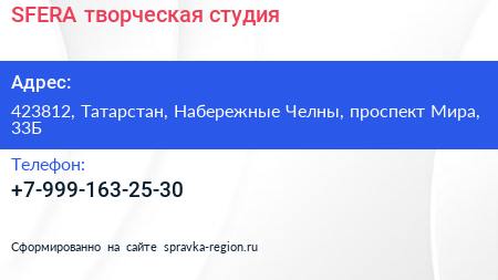 SFERA, творческая студия по адресу 423812, Татарстан, Набережные Челны, проспект Мира, 33Б в дальнейшем Организация, размещена в следующих категориях: