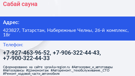 Сабай, сауна по адресу 423827, Татарстан, Набережные Челны, 26-й комплекс, 18г в дальнейшем Организация, размещена в следующих категориях: