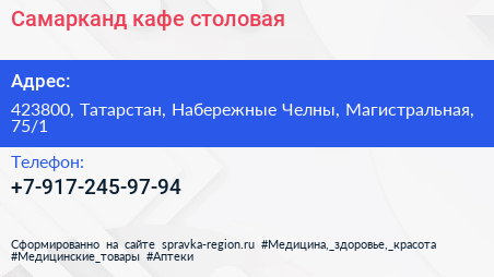 Самарканд, кафе-столовая по адресу 423800, Татарстан, Набережные Челны, Магистральная, 75/1 в дальнейшем Организация, размещена в следующих категориях: