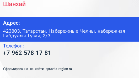 Шанхай по адресу 423803, Татарстан, Набережные Челны, набережная Габдуллы Тукая, 2/3 в дальнейшем Организация, размещена в следующих категориях: