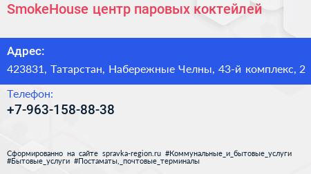 SmokeHouse, центр паровых коктейлей по адресу 423831, Татарстан, Набережные Челны, 43-й комплекс, 2 в дальнейшем Организация, размещена в следующих категориях: