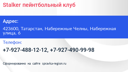Stalker, пейнтбольный клуб по адресу 423600, Татарстан, Набережные Челны, Набережная улица, 6 в дальнейшем Организация, размещена в следующих категориях: