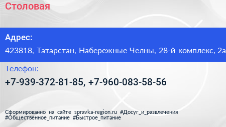 Столовая по адресу 423818, Татарстан, Набережные Челны, 28-й комплекс, 2а в дальнейшем Организация, размещена в следующих категориях: