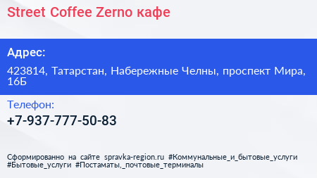 Street Coffee#Zerno, кафе по адресу 423814, Татарстан, Набережные Челны, проспект Мира, 16Б в дальнейшем Организация, размещена в следующих категориях: